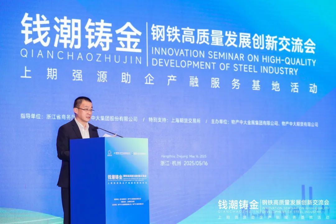 2025年5月16日,由浙江省商务厅、物产中大集团指导,上海期货交易所特别支持,物产中大金属与物产中大期货主办的“钱潮铸金——上期强源助企产融服务基地活动之钢铁高质量发展创新交流会”在杭州成功举行?;嵋榛憔凵虾F诨踅灰姿?、浙江省商务厅、五十余家产业链龙头企业以及研究机构代表,围绕钢铁行业产融结合创新路径展开深度研讨。
