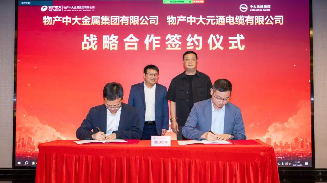 会议邀请物产中大元通实业党委委员(正职级)、物产中大元通电缆党委书记、董事长杨兆文作电缆合作交流及分享。在陈亦军、杨兆文的见证下,物产中大金属党委委员、副总经理王淦强与物产中大元通电缆党委副书记、总经理、副董事长屠渭江代表双方签订战略合作协议。根据协议精神,物产中大金属与物产中大元通电缆将共建国企、大客户联合开发平台,协同拓展电力基建、工程施工等领域线缆市场。